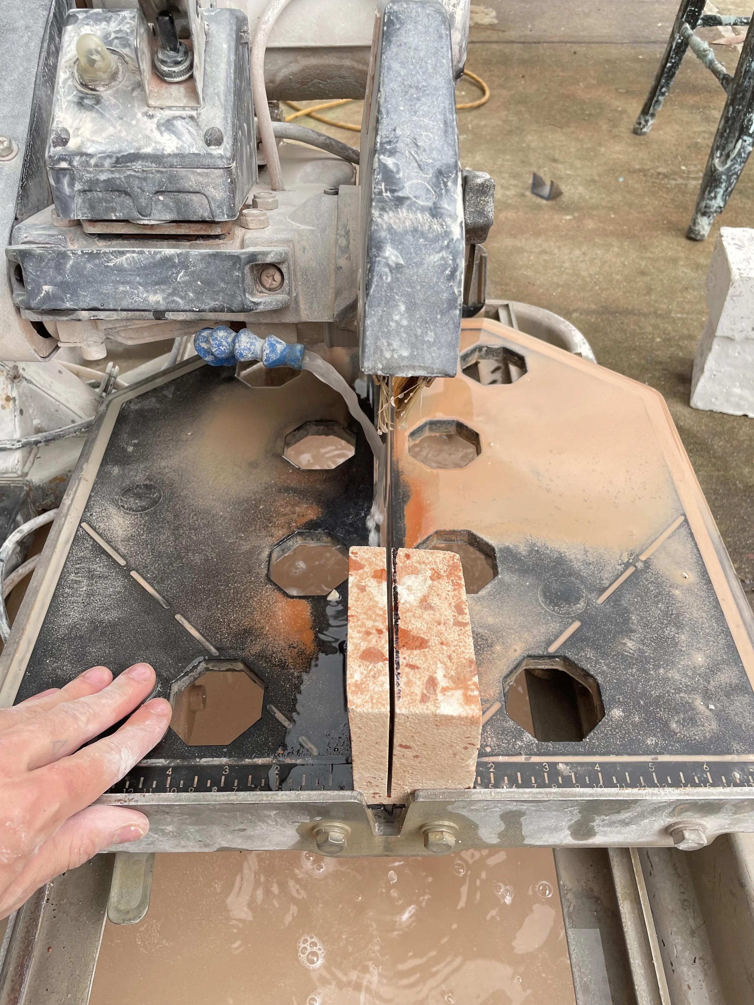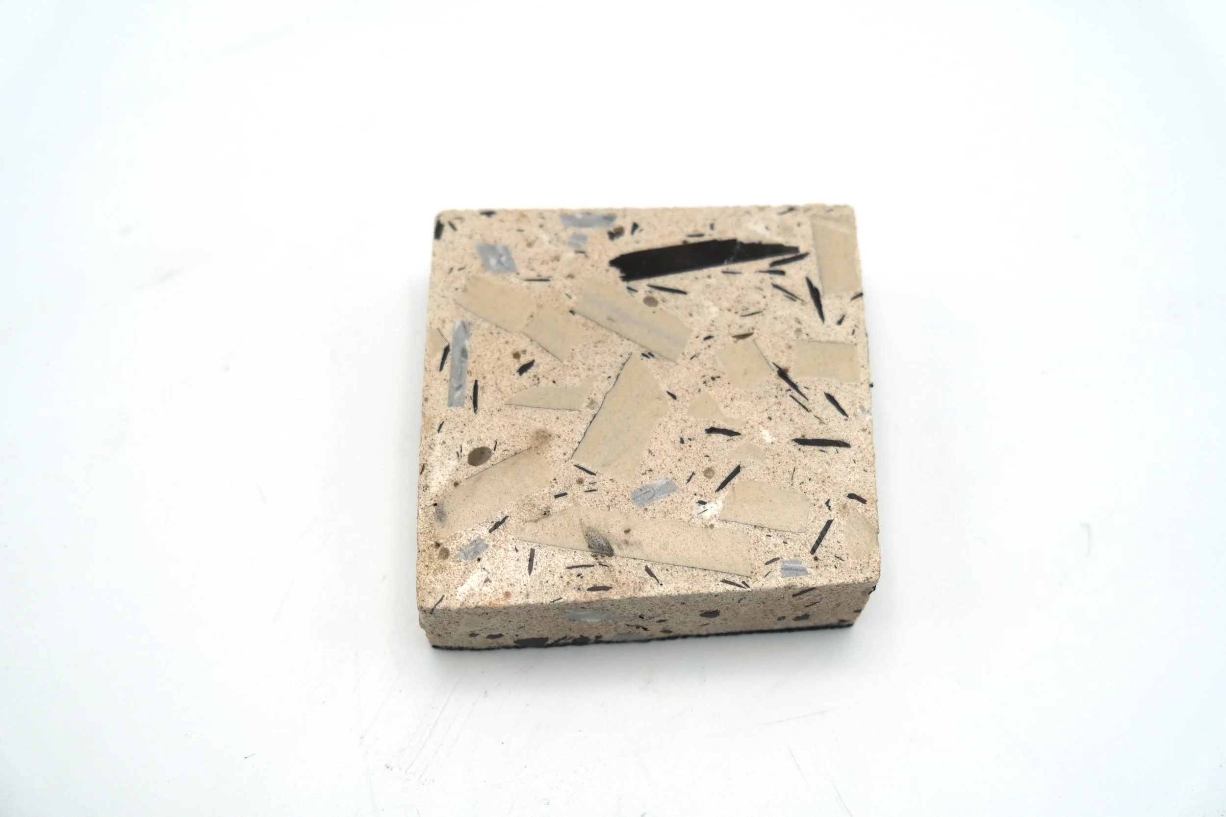 I participated in a research studio in which students closely examined the byproducts of building (think discarded pieces of lumber or broken tiles) and then reexamined the potential use they have in products or methods of construction. We first started with a vector drawing of a dumpster, indexing the materials and processes of construction. I became inspired by concrete production and wanted to create my own form of “terrazzo,” a decorative floor or wall treatment. However, I wanted to use traditional offcasts I found throughout New Orleans (glass bottles, discarded bricks, broken tiles, etc.) as the aggregate for concrete logs, which I then cut into tiles.