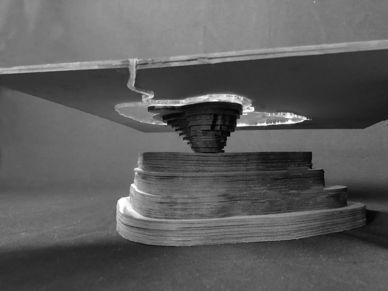 The Jefferson Island Visitor Center studies the salt mine disaster of Lake Peigneur on Jefferson Island, LA. The visitor center seeks to engage with historic pier and dock conditions on the lake. The physical model investigates the historic mine and the infamous sinkhole that caused the mine’s closure in 1980. South Louisiana is famously flat, and this sinkhole was so large and powerful that it actually reversed the flow of Delcambre Canal, causing saltwater from the Gulf of Mexico to flow into the lake.